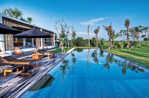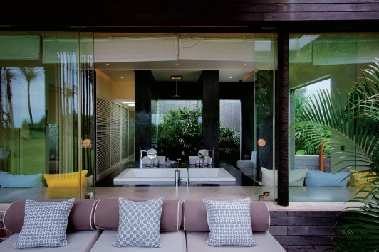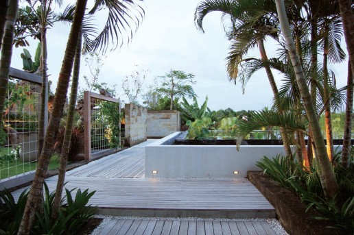 空間布局彰顯中央庭院觀念,各量體親密無間。各部分依不同水平的地基,呈種植箱狀態(tài)。各屋頂覆以綠植,或碧水連天。內(nèi)外之間,家居、建筑與自然之界,模糊界限,這是巴厘的魅力展現(xiàn)。