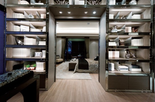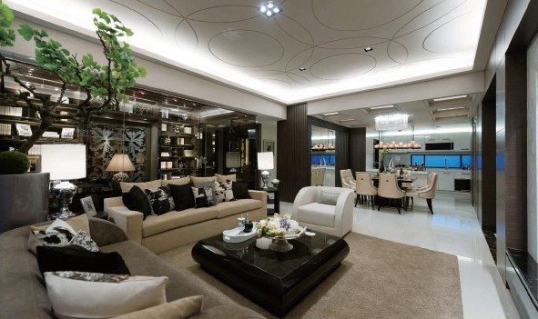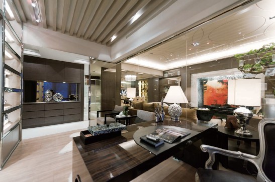 具穿透感的半開放式書房設(shè)計,與客、餐廳連成一體,充分表現(xiàn)出空間上視覺延伸的開闊感,電視墻面以銀狐石、黑云石及深色皮雕板,并以間接光加強光影對比的層次。