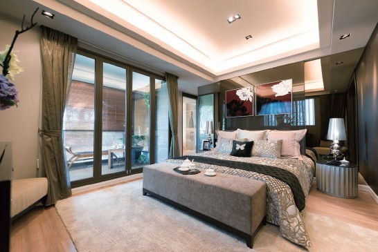 主臥空間利用馬鞍皮及曼特寧木皮打造出沉靜安定的質(zhì)感氛圍,床頭背墻以大面積的茶玻鏡面素材,加強空間的深度,大面落地玻璃門,將視野與戶外相融,陽臺景致更能引入室內(nèi)。更衣室內(nèi)部運用大量的鏡面增加空間放大效果。主衛(wèi)浴空間大面玻璃窗讓沐浴時光也能放松身心,享受自然。
