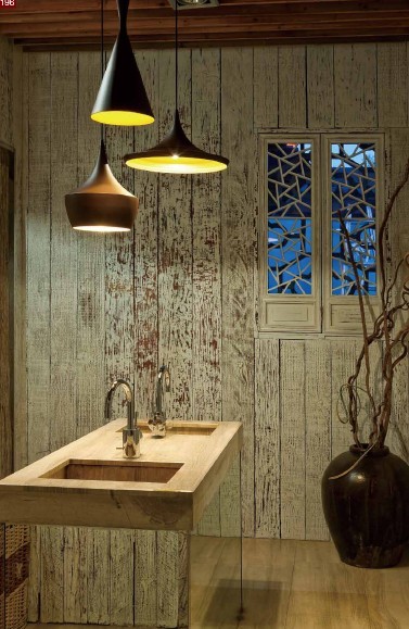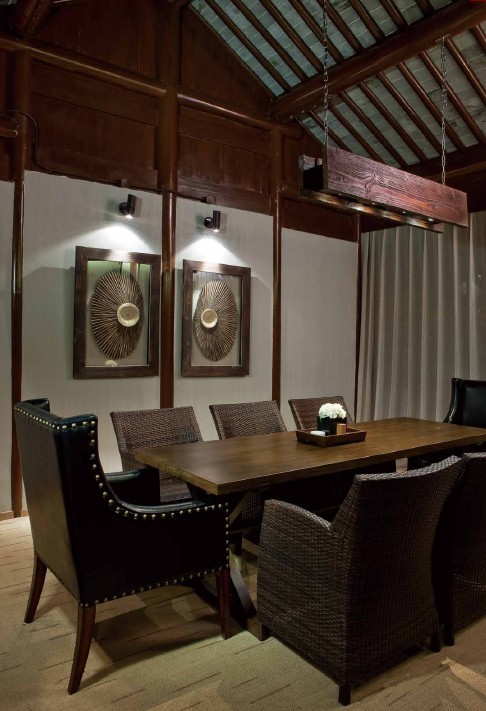 該建筑的風格是復古的,傳統(tǒng)的青磚地坪、大面積的木質梁柱與花格窗提供了一個深色調的繁復的空間背景。