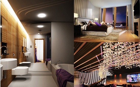 一層有一個(gè)泳池大廳,包含桑拿房,蒸汽室,淋浴室和酒吧。泳池在一天的不同時(shí)間有不同的照明效果。