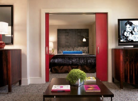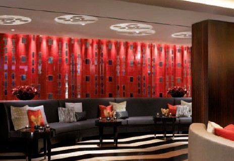 整個(gè)客廳的墻面上都安裝了一塊超大型的裝飾銅鏡,從鏡面中可看到足有天花板高的胭脂紅色的大理石壁爐。引人注目的曲形分區(qū)座椅的背景是閃閃發(fā)光的懸掛式亞克力板。玻璃、拋光鉻的運(yùn)用使整個(gè)會(huì)所設(shè)計(jì)增添了光彩和活力,涂了大紅色漆的墻面讓人不禁聯(lián)想到好萊塢明星們的烈焰紅唇,這樣的設(shè)計(jì)能強(qiáng)烈地吸引客人們走進(jìn)電梯廳,來(lái)到上層的客房。