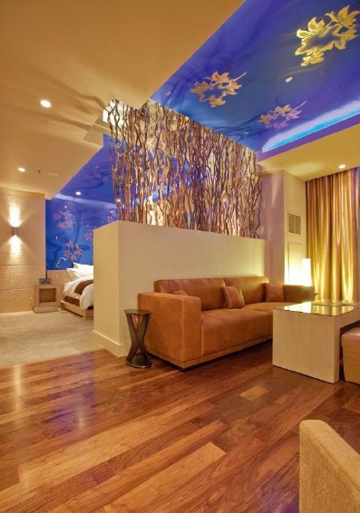 “邁阿密藍(lán)色風(fēng)情”套房意在營(yíng)造時(shí)尚夢(mèng)幻、極具邁阿密風(fēng)情的派對(duì)氛圍。套房?jī)?nèi)的一大亮點(diǎn)是一張巨大的C形睡床,床的周圍貼有藍(lán)色意大利進(jìn)口瓷磚。LED燈與床底燈光的烘托下,令人產(chǎn)生出一種床體懸浮于地面之上的奇妙幻覺(jué)。