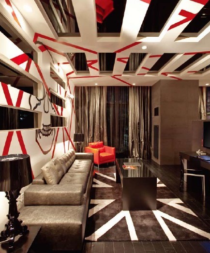 “朋克搖滾”套房意在構(gòu)建倫敦風(fēng)格的派對(duì)套房?;疑姆率瘔Υu、黑色的硬木地板、特別定制的時(shí)尚家具,以及手工制作、印有圖案的地毯,共同勾勒出濃厚的倫敦風(fēng)情。