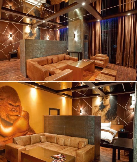 “猩猩”套房的設(shè)計(jì)理念為:構(gòu)建一個(gè)集圖書館與雪茄吧特色于一體的另類空間。金屬銀色的陶瓷墻磚與色澤濃厚的硬木地板形成鮮明對(duì)比,為套房帶來(lái)時(shí)尚之感;而青銅色鏡面吊頂、鱷魚皮紋家具、女孩與猩猩的巨幅手繪壁畫則使這里演變成黑暗、狂野、性感的都市叢林。