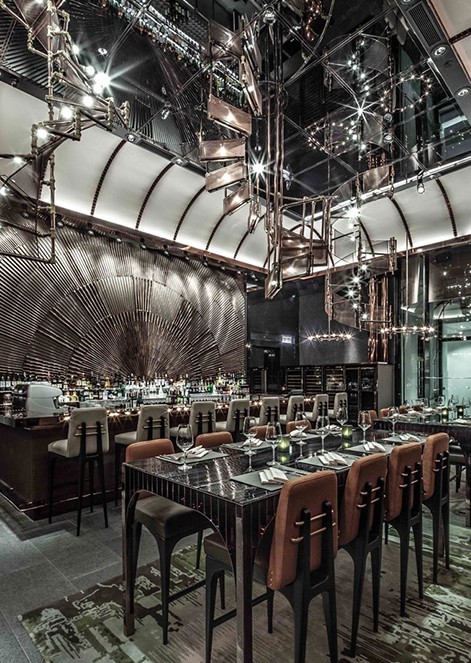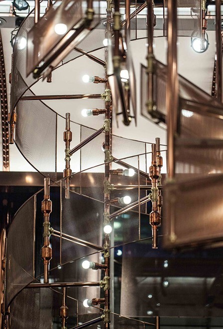 呼應(yīng)著電影的中心主題,餐廳中央設(shè)置了三道回旋階梯形吊燈,頗為奪目。銅制的水管從6m高的頂棚如瀑布般傾瀉而下,吊燈的罩幕以銅制卷曲絲網(wǎng)及鋼筋鑲嵌而成,營造出工廠及戰(zhàn)地的曠野氛圍。參照碉堡內(nèi)部建成的頂棚以銅制鋼筋作點(diǎn)綴,在柔黃燈光的襯托下,昔日的軍火庫宛如重現(xiàn)眼前。酒吧后面的裝飾壁畫同樣以銅制枝條鑄造,粗幼交替的鋪排方式形成一個(gè)巨型半圓圖案,從而引發(fā)客人的聯(lián)想,咀嚼當(dāng)中的歷史風(fēng)韻。