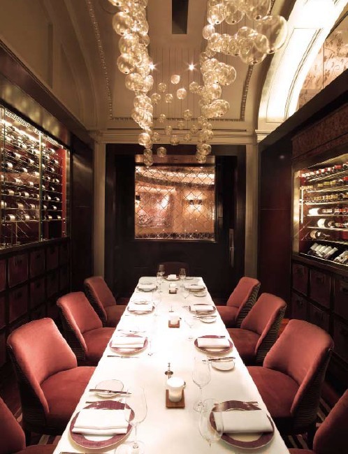 餐廳內(nèi)的家具以深紅色皮革包裹。餐廳的中心位置放有一個香檳色玻璃餐桌,餐桌上方懸掛著特別定制、由意大利制造商Barovier制作的紫紅色穆拉諾吊燈。