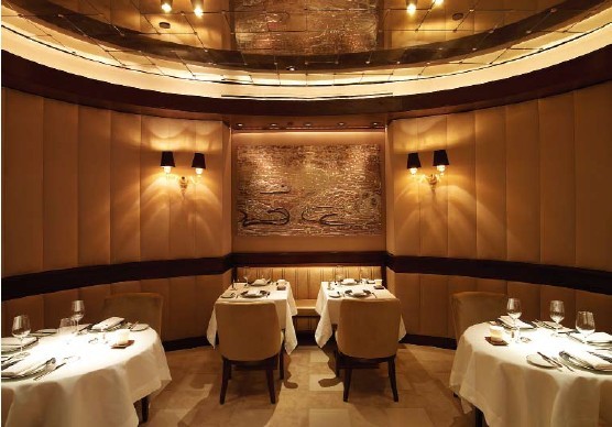 餐廳設(shè)有兩個休息區(qū),區(qū)內(nèi)有山羊皮桌面的青銅矮桌四周環(huán)繞著舒適的座椅,顧客可以悠閑地在此品嘗美酒。休息區(qū)位于主餐區(qū)的旁邊,櫥窗樣式的窗戶使休息區(qū)與亞斯特庭園通透一體。