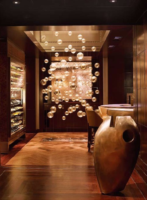 位于主餐廳一側(cè)的“Private Vault Room”是一處可容納12位賓客的私密就餐空間。房間內(nèi)放有一張3m長的山羊皮面餐桌,餐桌上方是一串由藝術(shù)家Ken Gangbar創(chuàng)作的金色玻璃球裝置。此外,這里還設(shè)有50個皮革罩面的私人酒窖。