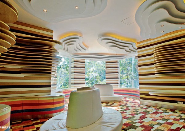 本休閑會(huì)所幾何圖案的設(shè)計(jì)隨處可見,會(huì)所設(shè)計(jì)公司對(duì)于幾何元素的表達(dá)和色彩的選擇也是精心布置的,沙丘波浪式的巖石層設(shè)計(jì)和鮮艷的色彩為兒童娛樂增添不少趣味。