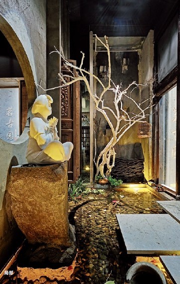 會所的入口處左側(cè)采用透明玻璃做“櫥窗”設(shè)計,現(xiàn)代的視覺模式與傳統(tǒng)的陳設(shè)元素在碰撞中襯托著對方的魅力,并產(chǎn)生了空間默契。而入口的玻璃門上采用了祥云的圖案,在紅色燈籠的光線映襯下,透露著一種若即若離的感覺,有著猶抱琵琶半遮面的韻味。正對大門的玄關(guān)則用石質(zhì)踏步、流水、侍女像、枯木等組合出一幅唯美的景致。玄關(guān)上的鏤空設(shè)計,讓室內(nèi)外的空間有了交流的可能。茗古園的第一次視覺表達便在形散神不散的設(shè)計物語中釋放著禪意,悄然打動著過往的人們。