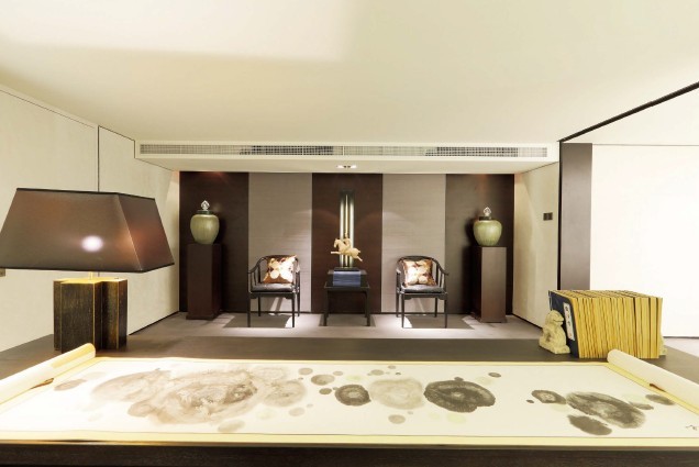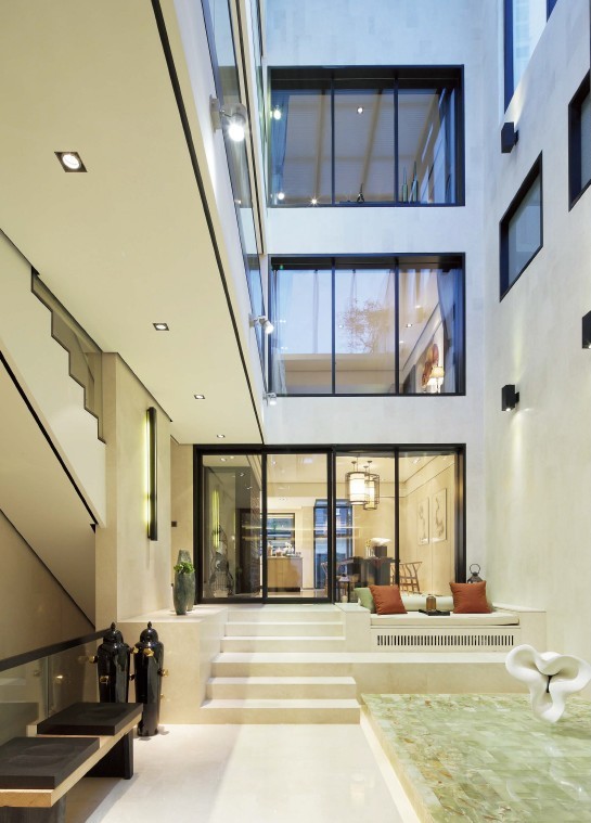 物質(zhì)與精神本案設(shè)計(jì)的核心是縱貫上下四層空間的室內(nèi)墻面,統(tǒng)一的米色大理石材質(zhì),沒有任何裝飾的白色吊頂,剔除了多余的元素、色彩、形狀和紋理。高達(dá)四層的空間里,這些光潔的大理石向上、向下延展開來,緊緊包裹和依附在建筑表面.創(chuàng)造了四白落地、如同中國畫留白一樣的視覺效果.凸顯出了其他設(shè)計(jì)內(nèi)容。方形黑色窗框、悠長的走廊扶手、硬朗的直線條家具,甚至是矮幾上的深色陶罐,都好像揮灑在白色的直妊上,飽蘸濃墨的一橫、一豎、—點(diǎn),人文氣息躍然紙上。
