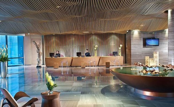 由灰木紋大理石鋪就的地面,兼顧了木與石雙重效果,滿足了視覺的享受也讓人產(chǎn)生一探究竟的好奇心。華麗卻感受不到張揚(yáng)。同樣是灰木紋的大理石墻壁上,是鏡面不銹鋼材質(zhì)的藝術(shù)裝置。與底下的木樁與蠟燭相互映襯。不遠(yuǎn)處的木頭裝置,以及再不遠(yuǎn)處的銅制蓮蓬,在搭配商務(wù)會(huì)所設(shè)計(jì)整體色調(diào)的同時(shí),散發(fā)著自然的氣息。大廳墻壁上的木質(zhì)漆藝裝置是仿制的藝術(shù)家蘇笑柏先生的大作,紅漆,斑駁,老舊,濃烈。懸掛著的覆漆瓦片,無序,大氣,同樣也是中國味的裝置藝術(shù)的體現(xiàn)。蛇口的陽光灑入,在兩件作品之上和之下投下更加斑駁的、或明或暗的影子。東方的特別現(xiàn)代。無論是環(huán)形的沙發(fā)還是明式的Shell Chair,抑或是前臺(tái)的聚酯椅,傳遞著東方的信號(hào),同時(shí)也呼應(yīng)著商務(wù)會(huì)所的主題。這是中國文化的別樣解讀。中國元素豐富而不呆板,處處充盈著靈動(dòng)的氣息??头靠臻g的風(fēng)格與商務(wù)會(huì)所大堂相呼應(yīng)。很值得一住。比較有特點(diǎn)的是吳冠中水墨畫為內(nèi)容的地毯,讓整個(gè)空間浸入詩意的氛圍,清雅而不造作。