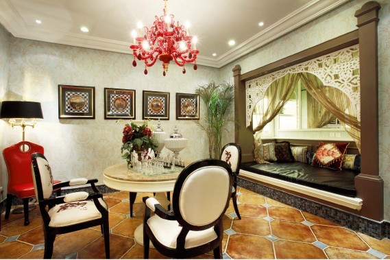 進(jìn)入戶內(nèi),便是玄關(guān)門廳。正對(duì)端景的玄關(guān)桌上擺放著復(fù)古銅臺(tái)燈及匍匐型花藝,透過兩側(cè)的豎向條窗,可以看見餐廳隅。玄關(guān)背后是圓形的六人位的餐桌,餐廳雖是盡端,卻明亮通透。正立面為戶外采光窗,與窖廳相鄰處為護(hù)欄,與客廳形成良好互動(dòng)。會(huì)客廳東立面是三個(gè)連拱形成的隔斷,中同的門拱是錯(cuò)層梯步的交道入口,左、右兩側(cè)拱下為功能性臺(tái)柜。會(huì)客廳是1+2+3 2發(fā)圍坐的家具布置模式,以壁爐為中心軸線的布局使本空間充滿凝聚經(jīng)過樓梯走上二層,右側(cè)為帶書房功能的女兒套房,左刪為主人書房,前方為二居公衛(wèi)。