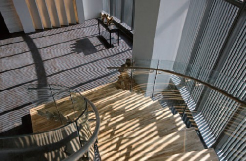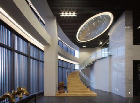 偌大的空間中,旋轉樓梯猶如飄逸柔順的絲帶在空中飛旋上升,轉折之間,靈動自如,將兩層空間串在一起。公共空間的弧形玻璃幕墻與之遙相呼應,倚窗而觀,激起一片指點江山的逸興豪情。在落地全幅玻璃幕墻內(nèi)側,商務會所設計公司以一排木柵欄作為內(nèi)外空間的界定,天光云影在柵欄的空隙間穿透,律動著光影與景觀的和諧鳴奏。夜幕降臨,窗外閃爍奪目的LED燈,透過玻璃幕墻瀉入室內(nèi),投射出赤橙黃綠青藍紫的萬千變幻。樓梯頂上,橢圓形的天幕,燈光閃耀如星,引人無限遐想。