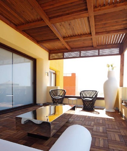 屋頂是整個(gè)會(huì)所設(shè)計(jì)中的重點(diǎn)部分,將涼亭區(qū)、吧區(qū)和游泳池籠罩其中。涼亭與吧臺(tái)靠近,形成供主人休息的乘涼空間。潤(rùn)澤的黑色大理石吧臺(tái)沿墻角而設(shè),幾把色彩鮮艷的Charles Ghost吧椅將其襯托得格外醒目,墻上一面大鏡子將美麗的戶外風(fēng)光映入其中。