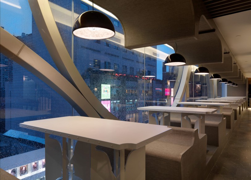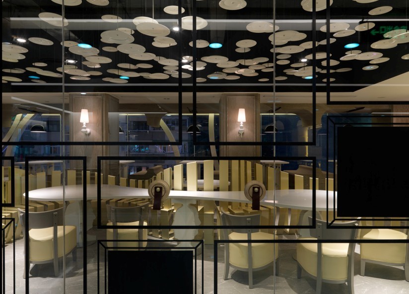 在色調(diào)上,會所設(shè)計公司整體使用調(diào)和色配色法,在黑白分明的天花板及灰色系地板的襯托下,設(shè)計主軸顯得更加明亮與協(xié)調(diào)。而層次分明、層層疊疊的幾何曲線,由淺至深引領(lǐng)觀者的視覺運(yùn)動。高低分明的座位區(qū)劃,使空間主體分明,層次多樣,在調(diào)和色系的平衡下,虛實(shí)之間更有豐富的語匯。