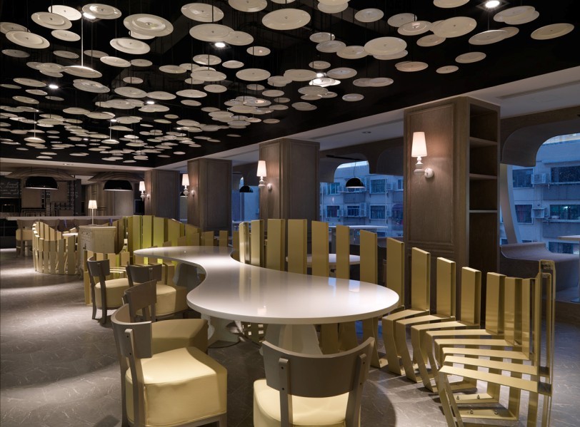 項目中的古典元素帶來的豐富寓意是本餐飲會所設(shè)計的一大特色。曲折蜿蜒的鐵件座椅,對用天花板上垂吊的純白磁質(zhì)器皿,帶領(lǐng)著人們進(jìn)入味覺與視覺的天堂,也寓意廚師們希望每份餐點(diǎn)都能帶給顧客層出不窮的驚喜,同時也成為本案設(shè)計的主軸。餐桌底下有趣的圖地反轉(zhuǎn)桌腳“魯賓之杯”則寓意著店主的期待;希望通過以人為本的服務(wù)精神使用餐者淋漓盡致地感受五感盛宴。