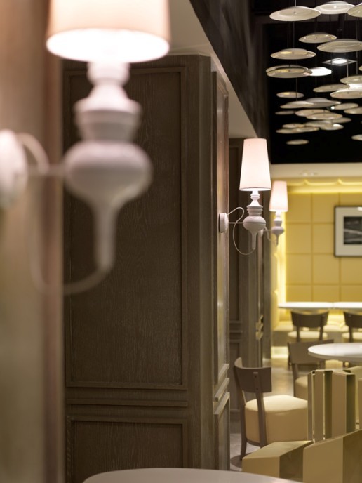 餐桌上空的半圓形吊燈以及安裝在每根柱子上的古典燈飾,讓人感受到歐洲古典文化的優(yōu)雅、從容。大面積玻璃窗邊以對稱幾何圖形作為裝飾,將視覺角度幾何化,增加空間趣味。