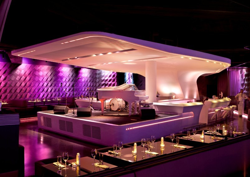 設(shè)計(jì)的核心是一尊白色的雕塑,其主要功能包括提供實(shí)況音樂的舞臺(tái),兩個(gè)酒吧以及后臺(tái)的酒廊等場地。座位和餐桌圍繞該雕塑中心分布,并且根據(jù)現(xiàn)場狀況調(diào)整成三個(gè)不同高度。位于舞臺(tái)正前方的舞池配合繽紛的燈光,吸引了人們的視線。這種位置安排使得就餐和表演的氛圍完美地融合在一起。