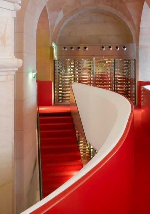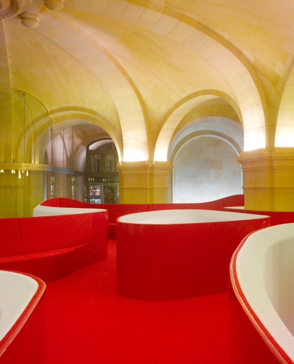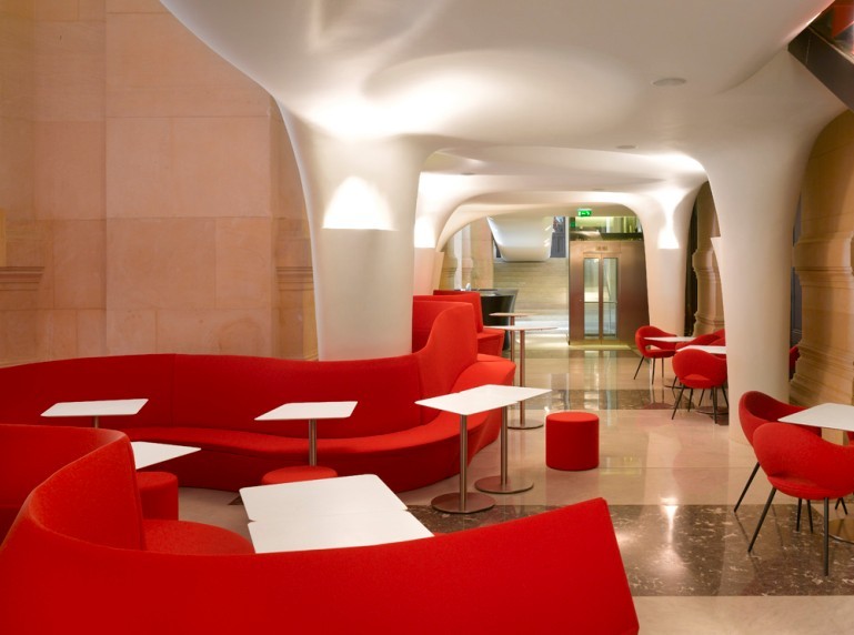 本休閑會所設(shè)計要求必須保證原有結(jié)構(gòu)的完整性,設(shè)計師從這一角度出發(fā),尊重古老空間的設(shè)計傳統(tǒng),運用當代建筑設(shè)計方式,通過石膏、鋼筋等材料呼應(yīng)建筑原有的曲線,圓形的拱頂帶來豐富的空間感。醒目的紅色座椅、長凳和地面營造了一種戲劇性的效果,讓客人們聯(lián)想到曾經(jīng)在這座劇院上演的劇目——歌劇院幽靈。