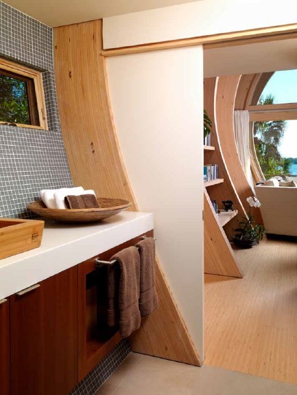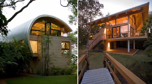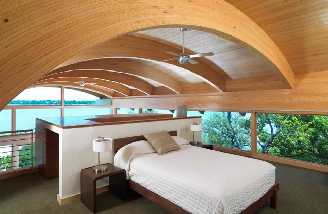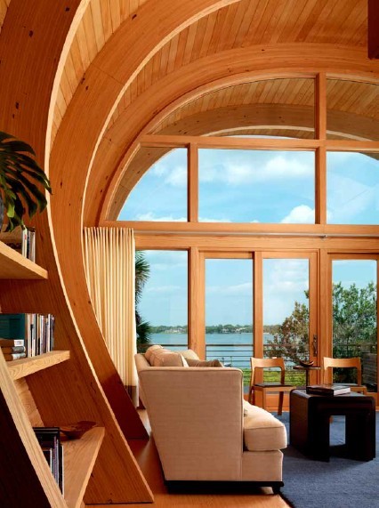 該建筑為拱形外觀,建筑底部使用層壓松木板來(lái)固定。該私人會(huì)所設(shè)計(jì)力圖建成一處“有機(jī)建筑”,它既受到所處環(huán)境的影響,又能體現(xiàn)環(huán)境的特點(diǎn)。