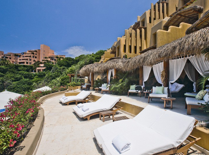 走進(jìn)私人會所的開放式大堂,迎接客人的是沙沙作響的棕櫚樹,還有在海風(fēng)中搖曳的蕨類植物,遠(yuǎn)處是開闊的太平洋景觀,入住登記柜臺強(qiáng)化了輕松、安靜的氛圍,裝點(diǎn)著柳枝與葉子花藤。一路往下望會發(fā)現(xiàn)一層又一層的花藤環(huán)繞著每層露臺,最底層是懸空在海面上的泳池甲板。