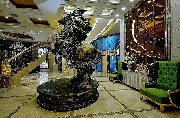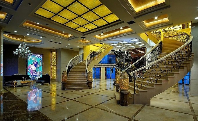 為了給前來(lái)的客人一份好的體驗(yàn),在一樓大廳設(shè)置了座位休閑區(qū),客人可以在此稍事休息片刻,當(dāng)然,也可以暫時(shí)與好友在此安靜地交談。休閑區(qū)上方的燈飾區(qū)別于周圍別處的燈飾,此處的燈飾更富現(xiàn)代與時(shí)尚感。多面的柱體映襯著廣告牌上的燈光和畫(huà)面,看上去別有一番情調(diào)。同樣,為了體現(xiàn)出空間格調(diào)上的豪華,一樓同時(shí)展示了一些極富美感的雕塑。
