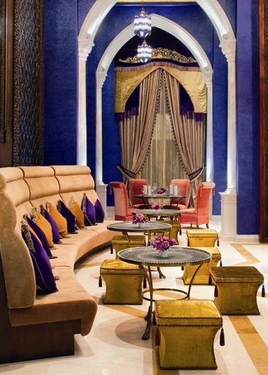 餐廳內(nèi)的簾幔飾以阿拉伯刺繡.與墻壁繪畫相得益彰。枝形吊燈由手工上色的玻璃制作而成,此類設(shè)計特色也可在Topkapi皇宮內(nèi)看到。