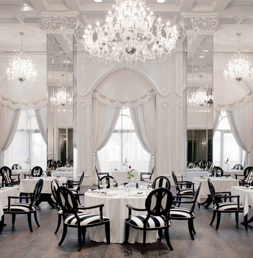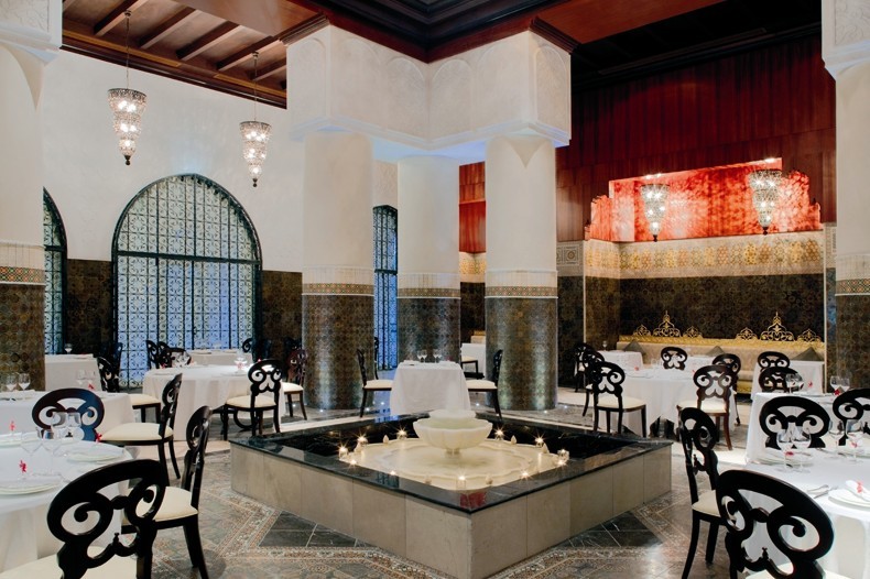 該餐廳內(nèi)部設(shè)計借鑒Dolma Bahja宮殿入口處的設(shè)計,走道兩旁矗立著高聳的立柱,盡頭兩端則放有巨 大的鏡面以營造出廣闊的視覺效果。桌椅都田黑木制作而成.而布藝制品則來自奧斯曼風(fēng)情的設(shè)計。天花板為手繪設(shè)計,絲質(zhì)簾幔綴以土耳其刺繡。地板則由黑色、褐色和粉色的大理石鋪制而成。