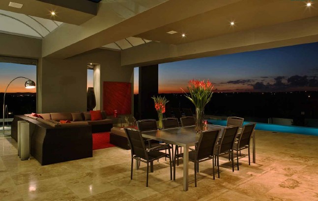 人們進入大廳,就可以看到開放式的休閑娛樂區(qū)、餐廳和廚房,再穿過無框玻璃門就是寬敞的陽臺和游泳池。娛樂室和陽臺之間的墻壁為玻璃結(jié)構(gòu),可以完全敞開。廚房與陽臺直接相連。廚房后部有餐具室、冷藏室、碗碟洗滌處和洗衣房等,廚房與車庫相連。樓上一側(cè)為主臥和浴室,它們被含壁爐的矮墻分隔開來。浴室設置有淋浴裝置、廁所和浴盆等,浴室一側(cè)與陽臺之間由高高的玻璃滑動門分隔成兩個空間,透過玻璃滑動門可以欣賞野生動物保護區(qū)的開闊美景。