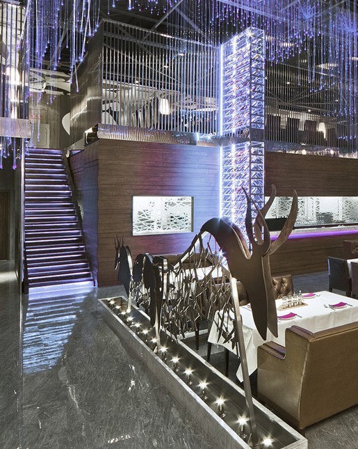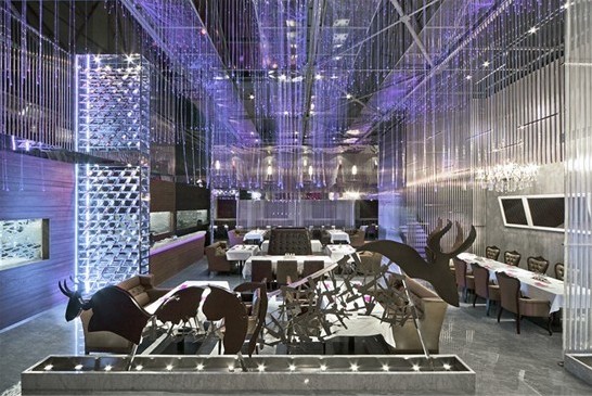 兩米高的雄牛屏風(fēng)用刀叉組成,它是紅酒會(huì)所的品牌標(biāo)志,使顧客一眼就能記住。