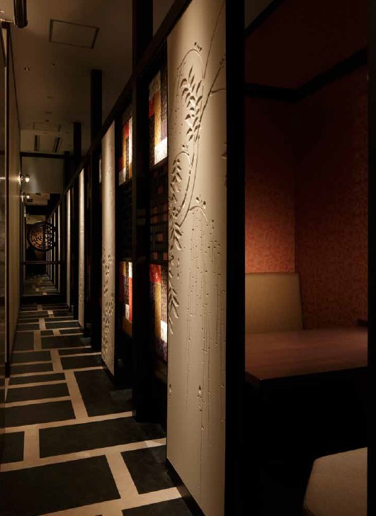 在以往的餐廳設計中,中國料理店似乎很少,在本案中為了靈活地滿足顧客多樣的需求,設計師精心規(guī)劃了房間的面積和布局。門店的外立面設置了竹子形狀的玻璃圓筒。設計師在玻璃圓筒上涂抹了金粉層,并配合安裝了照明設施。白色的繪制有竹葉的墻體和竹子形狀的玻璃圓筒將門店的外立面裝點得精致而生動。