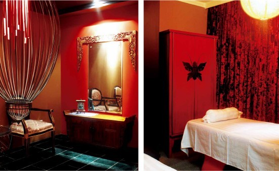 整個(gè)水療會(huì)所裝修為不落入傳統(tǒng)中式沉悶的色調(diào)中又采取了帶有東方奢靡情調(diào)的酒紅色、異域風(fēng)情的飾物以及各色紗幔垂簾所以在懷舊之中又帶有濃厚的香艷氣息。過道中質(zhì)樸的紅磚墻與精雕細(xì)刻的中式家具襯托著可供把玩的老木雕擺件和掛件使人能真切的感受到中國傳統(tǒng)文化的魅力。