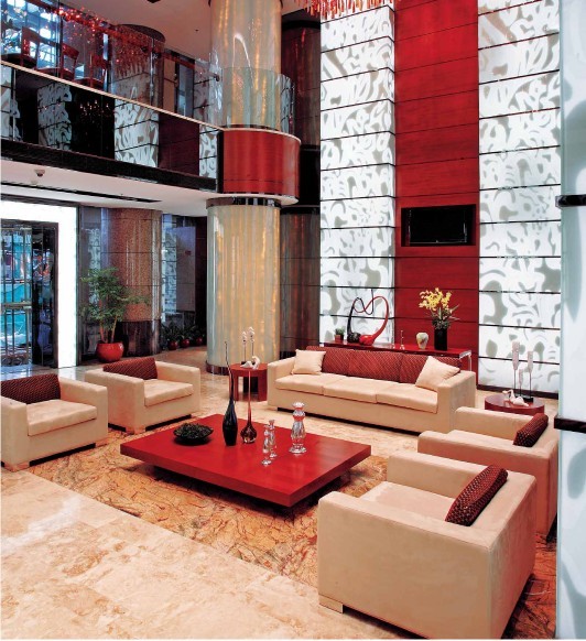 在一樓的休息區(qū)會所設(shè)計公司配置米色的沙發(fā),簡潔的造型,中和了濃厚的紅色,給空間增添一份舒適的感覺。大堂墻壁上的飾面晶瑩剔透,配以典雅的花紋,與大堂的整體氛圍相互映襯,凸顯了空間奢華的風(fēng)格。