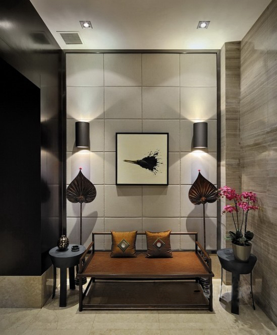 本商務(wù)會所的室內(nèi)空間非常開闊,有很大的斜屋面。在吊頂部分設(shè)計師希望呈現(xiàn)出東南亞木造建筑的感覺,所以采用了木行架的造型設(shè)計吊頂,并且將燈光照明融合在木行架吊頂?shù)脑O(shè)計中,使整個商務(wù)會所設(shè)計十分和諧并充滿東南亞式新東方主義風(fēng)情。