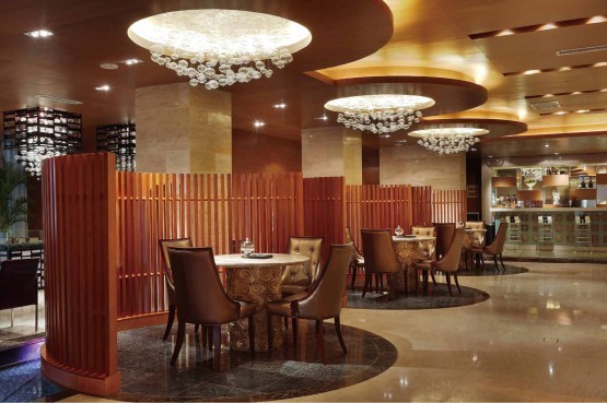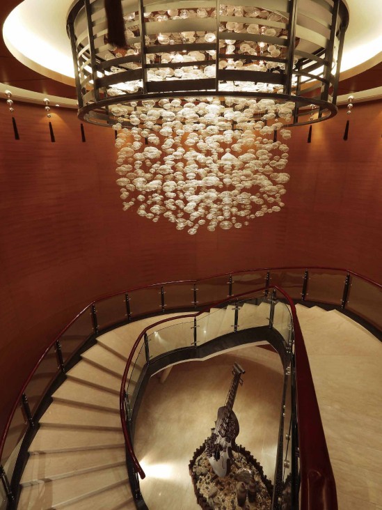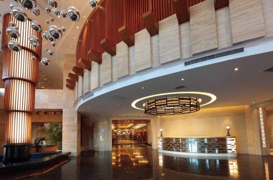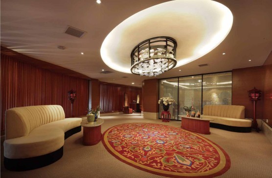 入口大堂的天花采用山與水的表現(xiàn)方法和紋理,與水滴般的氣泡燈融合在一起,構(gòu)成一幅空中滴水的意境,同時(shí),氣泡燈又延伸至空間的各個(gè)角落。