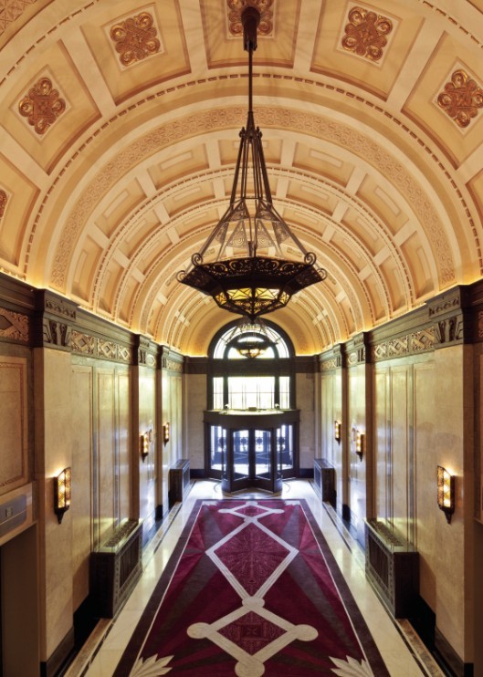重新磨光的銅制扶手和輕盈欄桿,由于附加了古銅和拋光的鎳而額具韻味。灰色紋理的大理石四周用瑰麗的法國圣勞芝深黑大理石鑲拼,還用核桃木進(jìn)行裝飾,再現(xiàn)了1930年代裝飾藝術(shù)盛行時的風(fēng)格…各種細(xì)節(jié)無不真實再現(xiàn)了當(dāng)年的風(fēng)貌。