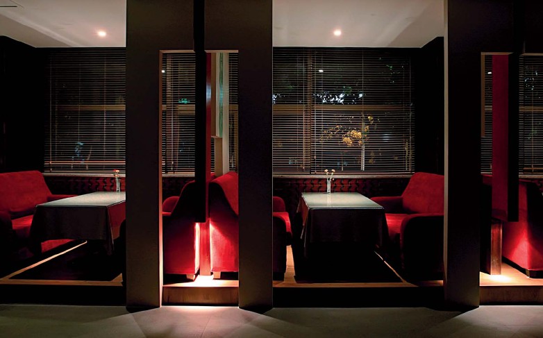 設(shè)計師大膽地采用暗色調(diào),制造出一種如深海般的深邃的感覺,而唯一的亮色或許就是那些懸浮在空中的五彩斑斕的魚。這種虛實不定的餐飲會所設(shè)計手法給空間帶來一種別樣的情緒。桌面干凈而整潔,在燈光下,你會看到剔透的玻璃杯和插在杯中的花,如同電影中的一些精致的畫面,而畫面只為營造一個良好的故事氛圍。