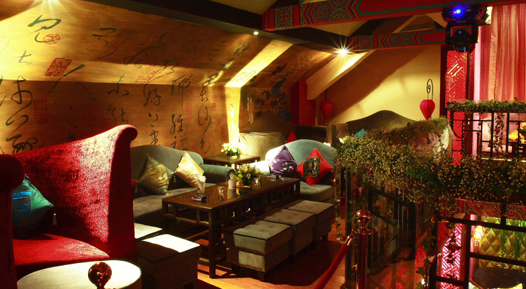 在蓮花府邸酒吧,大門酷似古時中藥店柜造型,暗色紅墻顯 在蓮花府邸酒吧,大門酷似古時中藥店柜造型,暗色紅墻顯得敦厚古樸。得敦厚古樸。自下而上仰視蓮花府邸酒吧里面的門窗,也可以看到紅與黑富有層次的變化。中部鏤空的深色木門,兩邊是紅色網(wǎng)格狀的紅色面板;紅色的墻壁與紅色的天花連為一體,天花板上相距對等的黑色線條成為區(qū)分兩者的標記。紅色的沙發(fā)將黑色的茶幾圍在中間,茶幾桌面劃分的紅色線條,使得茶杯、蠟燭臺、煙灰缸等零碎的小飾物各自“站”在屬于自己的區(qū)域里,沒有了胡亂堆積的凌亂布局。