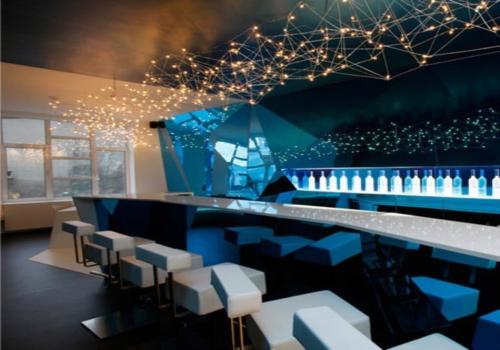 輕型大氣結(jié)構(gòu)是為這一項(xiàng)目而定制,反射閃爍的冰。星星點(diǎn)點(diǎn),反射在藍(lán)色的玻璃上,仿佛步入了另一個(gè)空間。白與藍(lán)的反差也在柔美的燈光下顯得和諧自然,讓人沉醉。