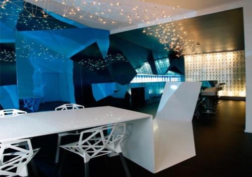 酒吧設(shè)計(jì)的特色是用藍(lán)色三角鏡面磚組成的一面墻,新異獨(dú)特,讓人眼前一亮。室內(nèi)設(shè)計(jì)運(yùn)用的藍(lán)色鏡子給人興奮的感覺,并別出心裁的切成三角形,安裝在三維墻壁上,在如此小的空間中創(chuàng)造出了更多的深度和觸感。客戶要求空間也可以被用作為會(huì)議室,這就是為什么高光澤酒吧中會(huì)設(shè)有會(huì)議桌。