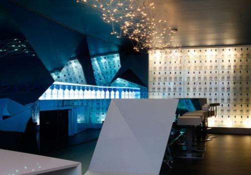 酒吧盡頭的設(shè)計(jì)很有創(chuàng)意!墻給空間戲劇感,沒有太多的“產(chǎn)品放置”。瓶子的用途是作為屏風(fēng),感覺像是一個(gè)冰墻。冰與藍(lán)的激情碰撞,別有一番風(fēng)味。