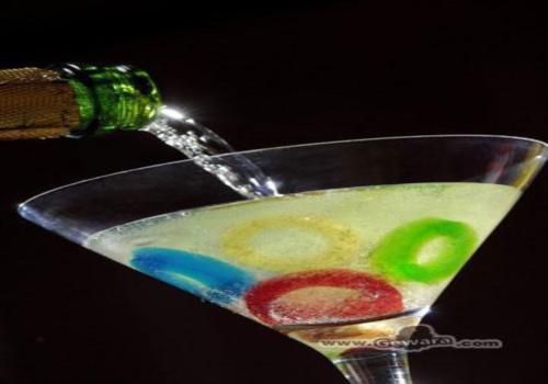 用湯匙背面朝上或用一根調(diào)酒棒放入杯中,依照比重順序慢慢地將酒倒入杯中即可調(diào)成五顏六色、層次分明之彩虹酒。