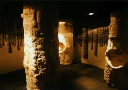 走進暖區(qū),入口設計以柔軟的毛皮展開,縱橫交錯的木條堆砌出柴枝感覺的墻,暗紅的燈光從四邊滲出,包裹著座位空間,營造出人們在寒冬圍在火爐邊取暖和溝通的氛圍??ㄎ徊糠值脑O計是用原木樹干建造出來的小木屋,充滿溫馨。