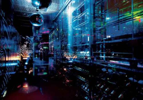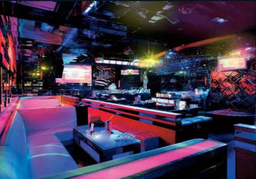 整個酒吧設(shè)計以黑色為主基調(diào),黑色玻璃珠外墻,黑鋼、黑鏡、黑色閃光墻紙做內(nèi)裝飾,甚至于黑色的不銹鋼電鍍洗手盆,使整個酒吧更顯高貴和神秘。LED變色管勾勒出酒吧英文標志MTC,大門上兩組LED照明燈安裝在特別訂制的黑色玻璃珠上,珠面將LED的反光映照得門庭生輝。大廳、卡座的燈光設(shè)計既隨意又大膽,色彩變幻莫測,極具時尚感。