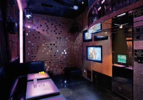 房間用黑色閃光人造革墻布及歐松板鑲嵌藍色、紅色鏡片做壁飾,加上黑鋼架、磨砂玻璃面做的茶幾,配合變幻迷離的燈光,令房間顯得時尚又高貴。