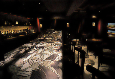具體說來,就是吸取省略、變形夸張、游樂之心的感覺,這些自古以來在日本繪畫、屏風(fēng)畫中常見的日式獨(dú)特表現(xiàn)手法。我采用動(dòng)畫片式的獨(dú)特風(fēng)格的酒吧設(shè)計(jì)想到了刺青吧臺(tái)。