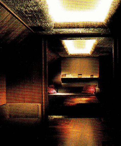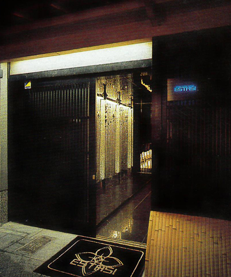 在京都東大路的酒吧‘ESTAS“’搬進了園北側(cè)的臨街店鋪中。這個酒吧設(shè)計的一個墻面貼著設(shè)有水晶簾和用帶氣泡的壓克立材料制成的光柱,另一種的墻面貼著鏡子映出對面的裝飾。由此通道看起來寬了很多。