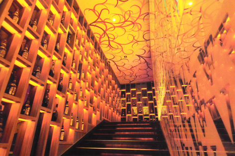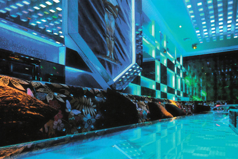 空間給人這樣的感受的同時(shí),將空間本身所創(chuàng)造的美感深深植入了客人的心中。這種感受讓人無法回避,也不想回避。藍(lán)色的光芒,映襯著玻璃地板。深色的墻壁上,LED燈打造出了夢幻的世界。天花的造型采取了多種形式,光線暗淡的區(qū)域給人深邃的感受。